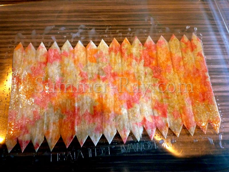 Place the paper onto the plastic tray and brush glue all over the inner side of the paper, taking care to cover every bit of paper from the middle to the tips.